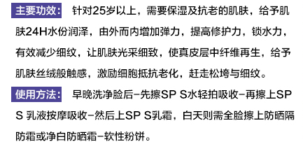 【使用方法】:早晚以保湿洗面乳清洁脸部后,喷保湿经妆水用手拍干,殖民地以保湿精华液擦拭,最后搭配适量的保湿霜擦拭。